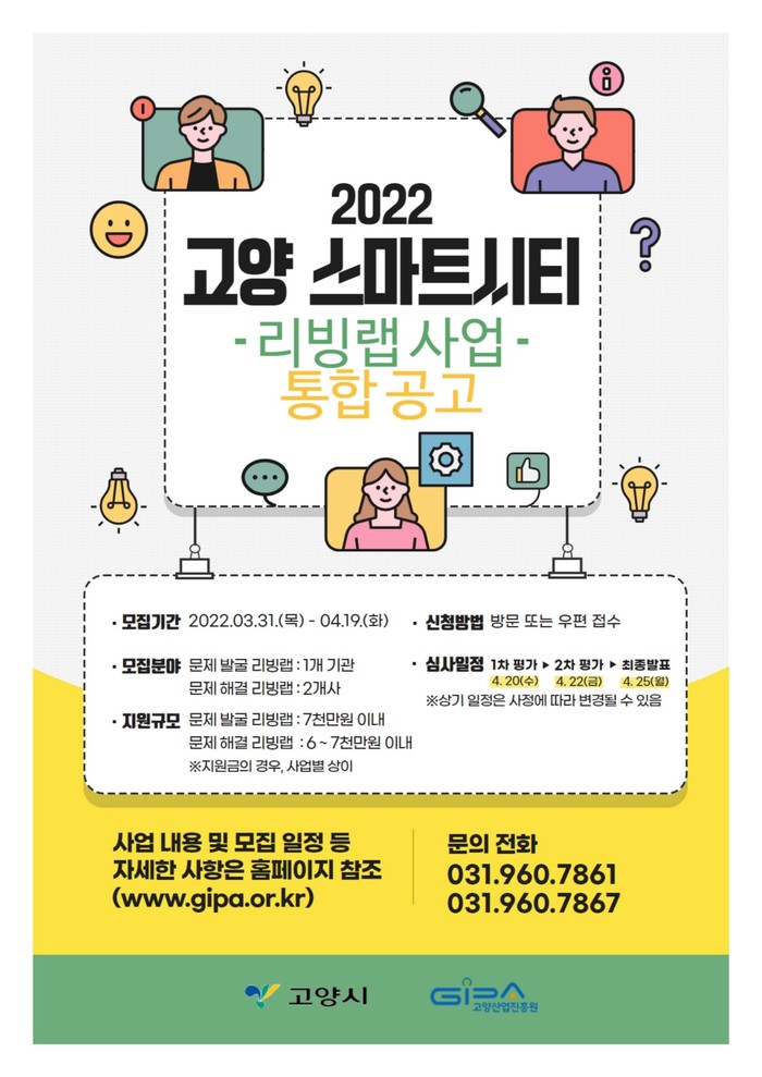 [고양=이기홍 기자] 고양시와 고양산업진흥원(이하 진흥원)은 시민과 함께 고양시 도시 문제를 발굴하고 발굴된 문제를 첨단 ICT(정보통신기술) 기술을 적용하여 해결하는 리빙랩 사업 추진을 위해 수행기관(기업)을 모집한다.