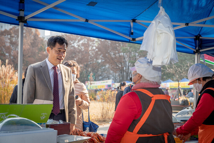 | ▲ 지난 김장철 직거래장터에서 상인과 소통하는 이기재 양천구청장. (사진=양천구청 제공) |