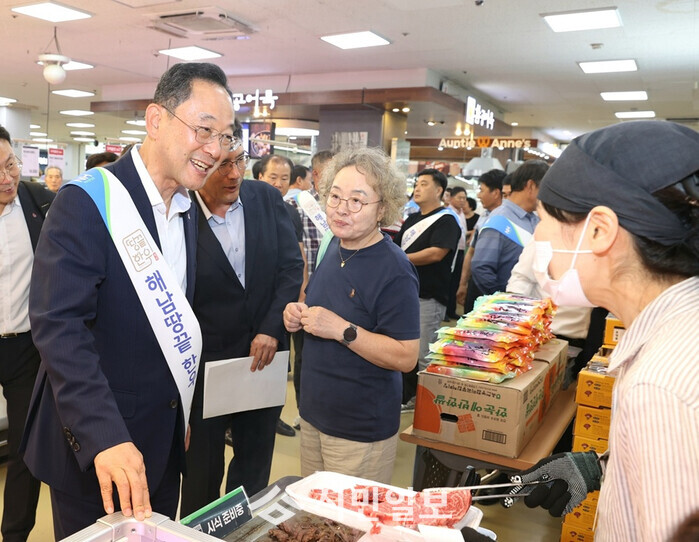 | ▲ 명현관 해남군수가 12일 서울 하나로마트 양재점에서 열린 해남땅끝한우 특판행사 시식코너를 찾아 관계자를 격려하고 있다. / 해남군 제공 |
