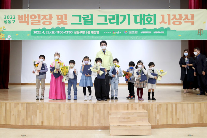 서울 성동구는 최근 '2022년 성동구 백일장 및 그림그리기 대회 시상식'을 개최했다. 이번 수상작품들은 오는 5월 초 왕십리광장에 AR(증강현실)방식으로 조성된 아트월 벽화에 게시할 예정이다. 사진은 시상식에서 정원오 구청장(가운데)과 수상한 어린이들이 기념촬영을 하는 모습. (사진제공=성동구청)