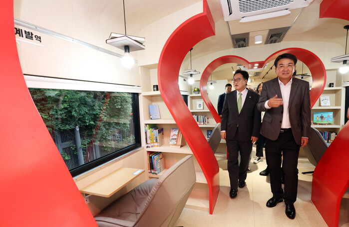 오승록 노원구청장이 23일 ‘경춘스테이션 북&커피’ 개관식에 참석했다. 경춘스테이션 북&커피는 서울시와 노원구가 경춘선숲길에 위치한 방문자센터를 리모델링해 ‘책쉼터와 카페’를 결합한 복합문화공간으로 조성한 곳이다. 사진은 오 구청장(오른쪽)이 시설 라운딩을 하는 모습. (사진=노원구청 제공)