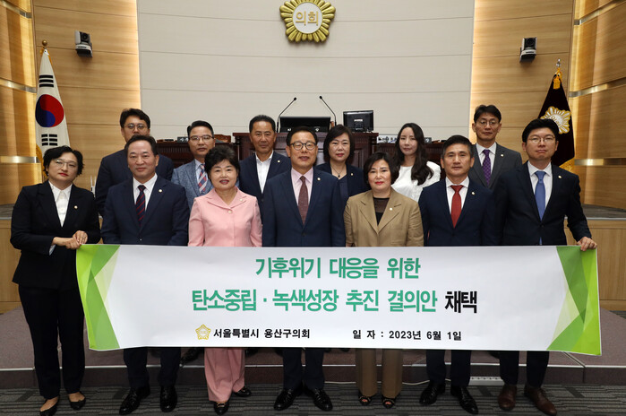 이번 결의문은 구의원 12명이 공동발의(대표발의 이미재) 한 것으로, ▲용산구의회는 2050 탄소중립 목표달성을 위해 지방정부의 탄소중립 정책을 견인하고, 탄소배출 제로 관점의 의정활동에 임할 것 ▲탄소국경조정제도 시행에 대비한 지역 중소기업체 보호와 에너지 빈곤층을 위한 지방정부 기후정책 수립을 견인할 것 ▲지역 특성에 맞는 기후위기 대응 정책 제안을 위해 연구하며, 지역단위의 공공기관·산업체·주민·연구기관 시민단체 간 네트워크 강화를 위해 적극 협력할 것 ▲지역주민들의 기후위기 대응공동체 활성화 및 지원을 위한 제도 마련과 예산 수립에 적극 동참할 것 ▲2050 탄소중립 지방정부 달성을 위해 전 분야에 앞장서 노력할 것이라는 내용을 담고 있다.