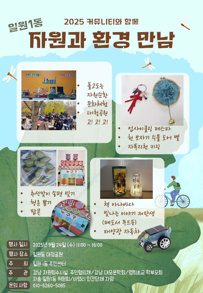 [시민일보 = 이대우 기자] 강남구(구청장 조성명) 일원1동이 오는 24일 대청공원에서 ‘자원과 환경의 만남’ 행사를 개최한다.