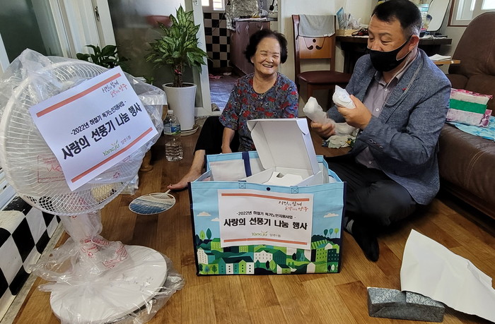경기 양주시 양주1동 행정복지센터는 이달 초부터 폭염에 취약한 홀몸노인의 안전을 확인하기 위해 양주1동 지역사회보장협의체, 복지 통장 등과 함께 가정방문을 통한 모니터링을 진행하고 온열질환 대비 하절기용품(선풍기·생수 등) 지원 등 다양한 활동을 실시했다. 사진은 동 관계자가 대상노인 가구를 찾아 하절기용품을 전달하고 있는 모습. (사진제공=양주시청)