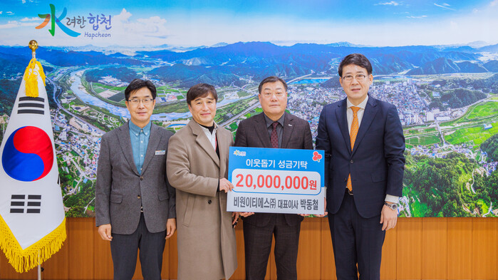 [합천=이영수 기자] 비원이티에스(주)(대표이사 박동철)는 6일 합천군을 방문해 관내 저소득층 지원을 위한 이웃돕기 성금 3000만원을 기탁했다.