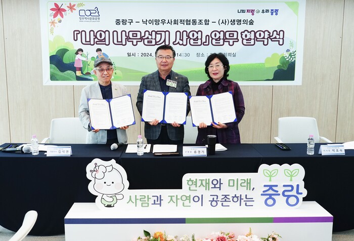 [시민일보 = 여영준 기자] 중랑구(구청장 류경기)가 최근 낙이망우사회적협동조합과 (사)생명의숲과 함께 망우역사문화공원에서 진행될 ‘나의 나무심기 사업’ 업무협약을 체결했다.
