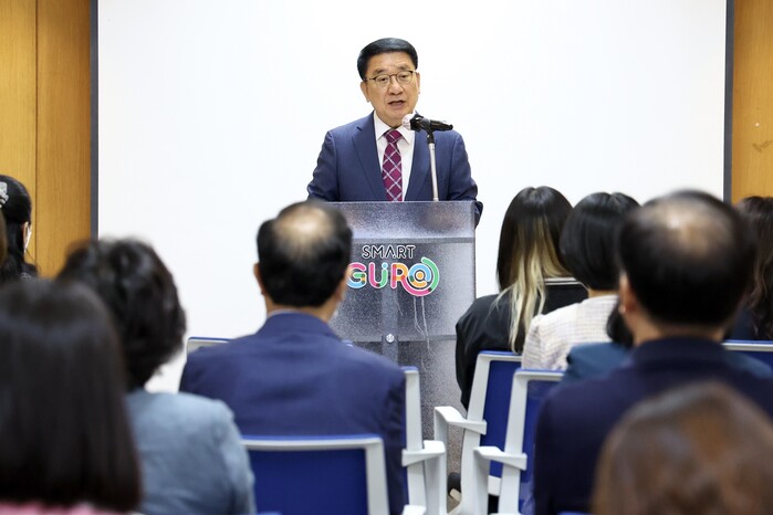 | ▲ 문헌일 구청장이 지난 6월 구청 창의홀에서 열린 아동돌봄시설 간담회에서 인사말을 하고 있다. (사진=구로구청 제공) |