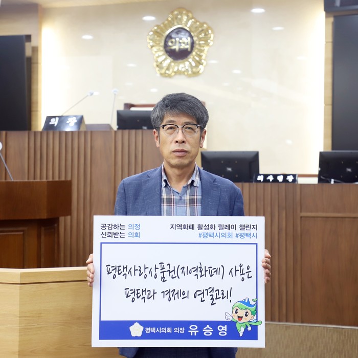 [평택=오왕석 기자] 평택시의회 유승영 의장은 28일 민생 안정과 지역경제 활성화를 위해 ‘지역경제 살리는 지역화폐 사용 함께해요’ 릴레이 챌린지에 동참했다.