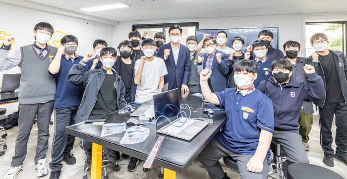 박성수 서울 송파구청장은 지난 19일 민선7기 역점사업인 구 자체 교육지원 시스템 ‘송파쌤 미래교육센터’ 14개관 중 5곳을 현장 방문하고, 이용 주민들의 의견을 청취했다. 사진은 송파쌤 미래교육센터 오금 Hub(7관) '메이킹 입문·프로젝트 프로그램' 수강 학생들과 박 구청장(가운데)이 기념촬영을 하고 있는 모습. (사진제공=송파구청)