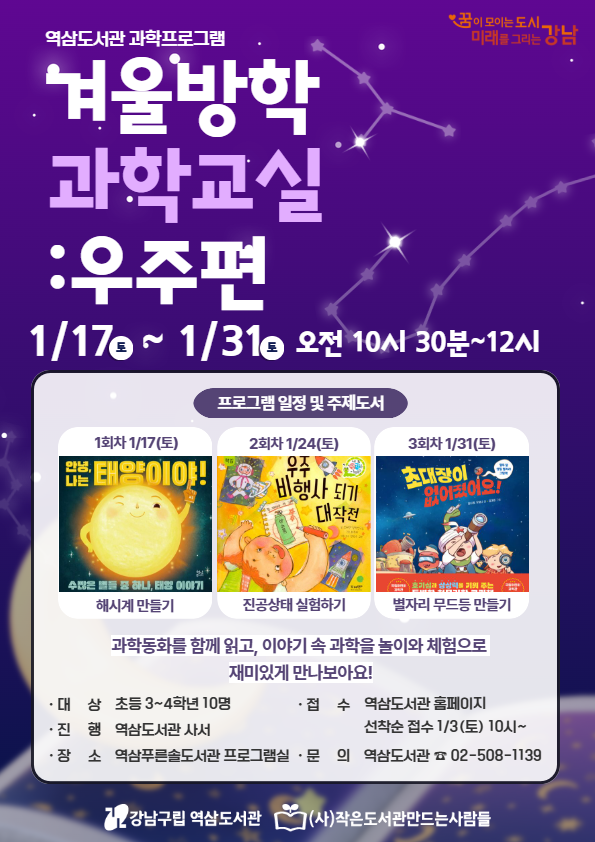 [시민일보 = 이대우 기자] 서울 강남구립 역삼도서관이 오는 17~31일 초등 3~4학년을 대상으로 과학 체험 프로그램 ‘겨울방학 과학교실: 우주편’을 운영한다.