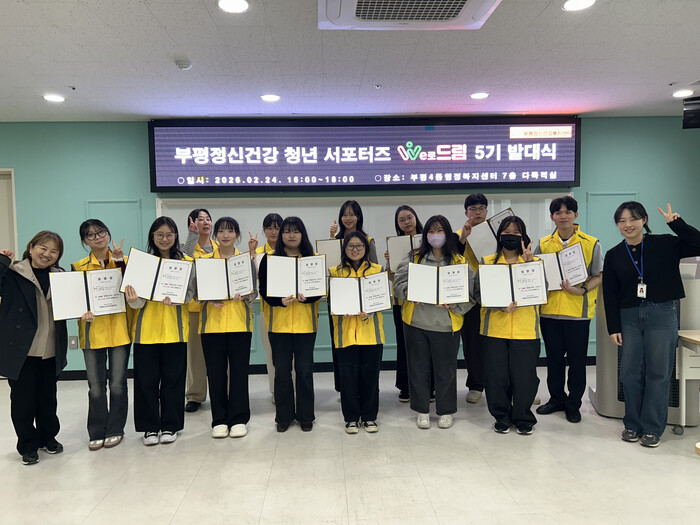 [인천=문찬식 기자] 인천 부평구 부평정신건강복지센터는 지난 24일 부평4동 행정복지센터에서 청년 정신건강 서포터즈 ‘We로 드림’ 5기 발대식을 개최했다고 밝혔다.