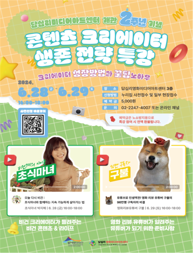 우선 6. 28.~29. ‘콘텐츠 크리에이터 생존 전략 특강’을 통해 영상 크리에이터를 꿈꾸는 이들에게 콘텐츠 제작 및 활동 방법을 알려준다.