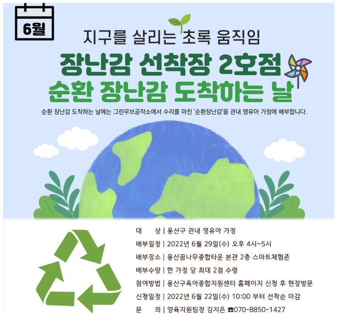 [시민일보 = 홍덕표 기자] 서울 용산구(구청장 성장현)가 오는 29일 용산구육아종합지원센터에서 장난감 선착장 2호점 '6월 순환 장난감 도착하는 날'을 운영한다.