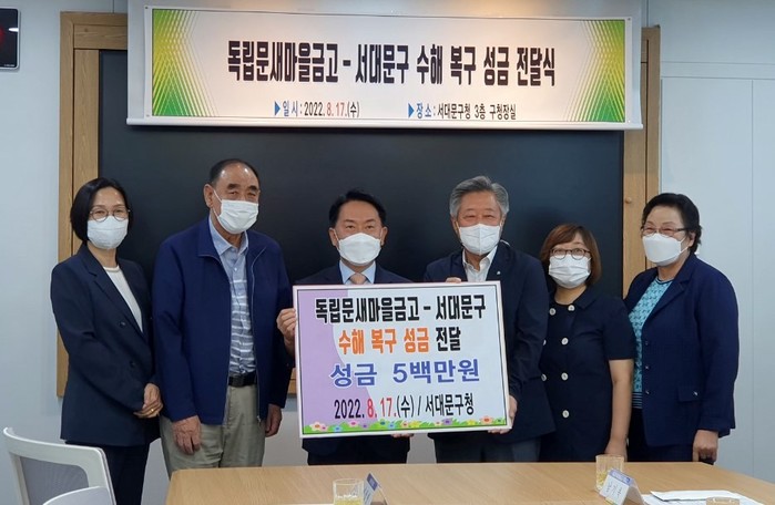 서울 서대문구는 천연동에 위치한 독립문새마을금고로부터 17일 500만원의 수해 복구 성금을 전달받았다. 이번 기부금은 침수 발생 가구의 주거비 지원 등으로 사용될 예정이다. 사진은 전달식에서 이성헌 구청장(왼쪽 세 번째)이 관계자들과 기념촬영을 하고 있는 모습. (사진제공=서대문구청)