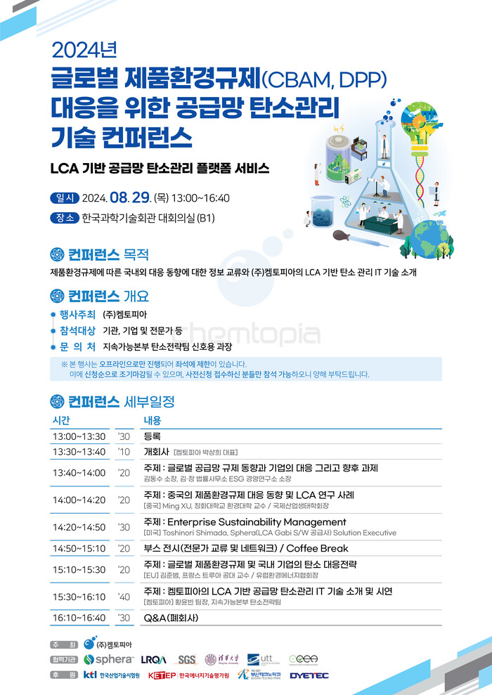 본 컨퍼런스에서 켐토피아는 기업이 개별 제품의 탄소배출량 계산에 소요되는 시간과 비용을 절감하여 기업의 규제 리스크를 효과적으로 관리할 수 있는 LCA 기반 공급망 탄소 관리플랫폼인 ‘Carbon-Slim’을 선보일 예정이며, 이를 통하여 기후위기 대응을 위한 산업 대전환 시대의 새로운 패러다임을 제시하고자 한다. 사전등록은 켐토피아 대표 홈페이지를 통해 가능하다.