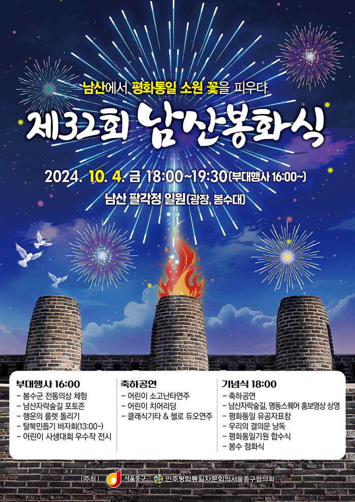 구 관계자는 “세계적으로 평화와 화합이 그 어느 때보다 절실한 지금, 남산 봉화식을 통해 전 세대가 일상의 평화에 대한 소중함을 다시 한번 느끼고 이를 지키기 위해 노력하는 계기가 되길 바란다”고 전했다.