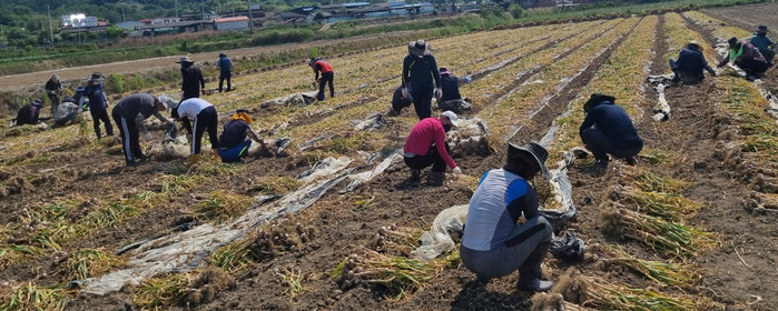 24일 합천군 산림과 직원 30여 명은 초계면 중리에 위치한 마늘 농가를 방문해 마늘수확 및 주변 정리 등에 구슬땀을 흘렸다.
