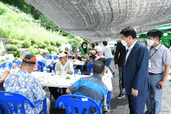 경기 구리시 교문1동 새마을부녀회는 최근 지역내 홀몸노인들에게 가족을 대신해 '생신상 차려드리기' 행사를 진행해 직접 보양식 삼계탕과 겉절이를 마련하고, 이를 지역내 홀몸노인 2분기(4~6월)에 생일을 맞은 50명에게 대접했다. 사진은 행사에 참석한 백경현 시장(오른쪽 두 번째)이 노인들을 격려하고 있는 모습. (사진제공=구리시청)