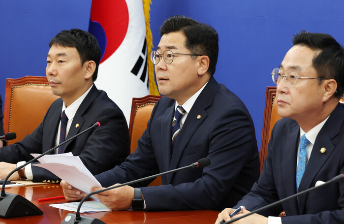 민주당 박찬대 대표 직무대행 겸 원내대표는 이날 취임 100일 기념 간담회에서 채상병 특검과 관련해 "민주당은 일단 3번째 자체 특검법을 내놓을 것"이라며 "이번 법안엔 그동안 드러났던 여러 가지 정황을 구체적으로 수사 대상에 언급할 것"이라고 말했다.