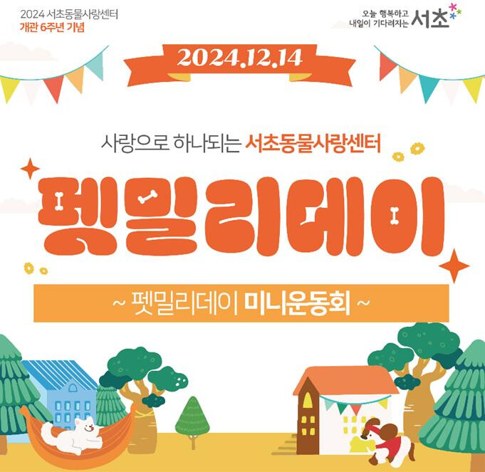 [시민일보 = 이대우 기자] 서초구(구청장 전성수)가 오는 14일 2시 구청 2층 대강당에서 서초동물사랑센터 개관 6주년을 기념해 반려견 입양 가족들이 사랑으로 하나 되는 ‘펫밀리데이(Pet+Family)’ 행사를 개최한다고 밝혔다.