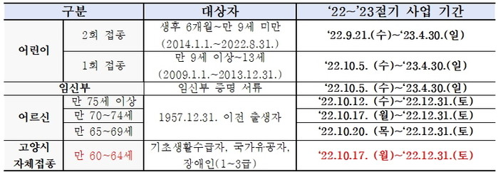 대상자별 접종일정(사진 참조) 및 고양시 지정 위탁의료기관은 고양시보건소 홈페이지, 예방접종 도우미 사이트에서 확인할 수 있다.