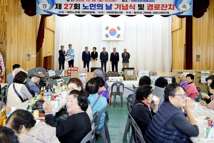 대한노인회 가야면분회(회장 최준구)가 주최하고 가야면 청년회(회장 이길화)가 주관한 이날 기념행사에는 김윤철 합천군수와 조삼술 합천군의회의장, 장진영 경상남도의회의원, 신명기 합천군의회의원을 비롯한 내빈과 지역 어르신 등 800여명이 참석했다.