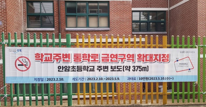 [시민일보 = 홍덕표 기자] 서울 성북구(구청장 이승로)는 간접흡연으로부터 아동·청소년을 보호하기 위해 지역내 안암초등학교 통학로 일대 375m를 금연구역으로 확대 지정했다고 13일 밝혔다.