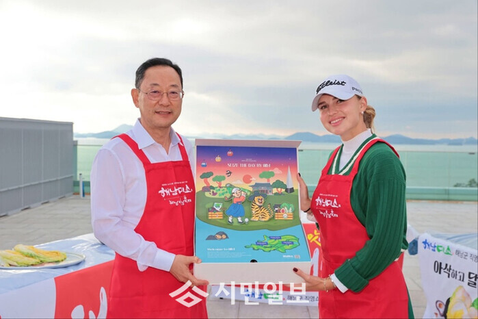 | ▲ 명현관 해남군수(왼 쪽)가 16일 LPGA대회 기념해 출시한 해남미소 선물세트를 나탈리아 구세바 러시아 선수와 함께 홍보 하고 있다 해남군 제공 |