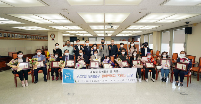서울 동대문구가 20일 제42회 장애인의 날을 맞아 장애인복지유공표창 수여자 12명을 확정해 표창식을 진행했다. 장애인복지 종사자, 자원봉사자 및 후원자를 포함해 장애인의 복지향상 등에 노력한 유공자들이 참석했다. 사진은 이날 표창식에서 최홍연 부구청장이 수상자들과 기념촬영을 하는 모습. (사진제공=동대문구청)