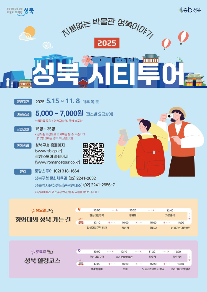 성북 시티투어 참가비는 코스별로 5000원에서 7000원이며, 회차별 모집 인원은 15명에서 35명으로, 선착순 마감된다. 예약은 구청 홈페이지와 로망스투어 홈페이지를 통해 진행할 수 있다.