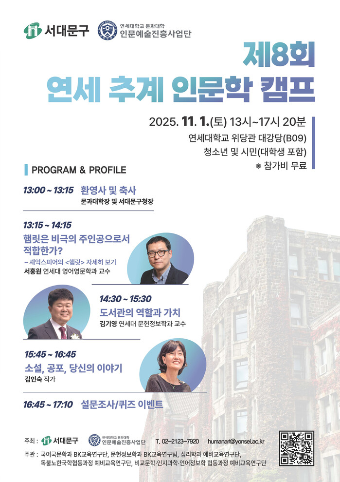 [시민일보 = 이대우 기자] 서대문구(구청장 이성헌)가 연세대학교 문과대학과 공동으로 오는 11월1일 오후 1시~5시20분 연세대 위당관 대강당(B09호)에서 ‘제8회 연세 인문학 캠프’를 개최한다.