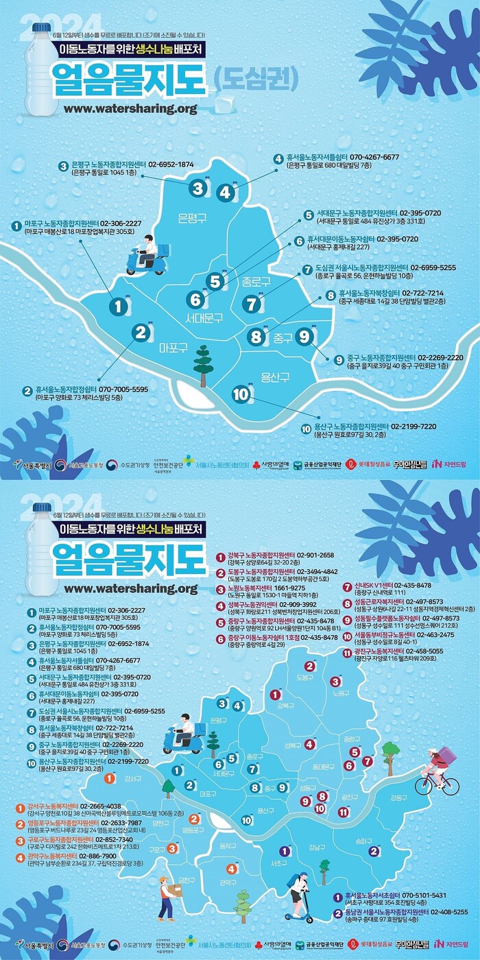 생수 배포 장소는 서울시립 및 구립 노동센터 18개, 휴(休)이동노동자쉼터(서초, 북창, 합정, 녹번) 4개 등 총 27곳이다. 은평구 노동자종합지원센터 누리집 공지사항에서 얼음물 지도를 확인할 수 있다.