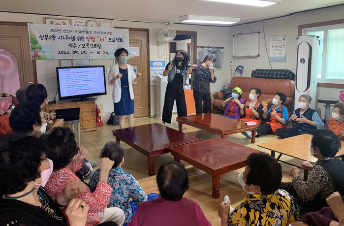 경기 안산시 단원구 선부2동 주민자치회는 25일 지역내 석수경로당에서 노인 20명과 ‘씽씽 뇌 프로젝트’ 교실을 개최해 신나는 음악 바디타, 인지회상 퍼즐게임 등 치매예방 인지놀이 및 아로마 로션 만들기 등 활력증진 프로그램을 진행했다. 사진은 이날 씽씽 뇌 프로젝트 교실을 진행하고 있는 모습. (사진제공=안산시청)
