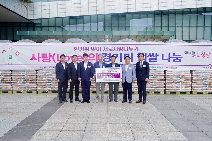시는 이날 오전 11시 시청광장에서 신상진 성남시장과 양흥식 농협 성남시지부장, 김효진 경기 사회복지공동모금회 사무처장 등이 참석한 가운데 ‘2025년 한가위 맞이 서로 사랑 나누기 쌀 전달식’을 했다.