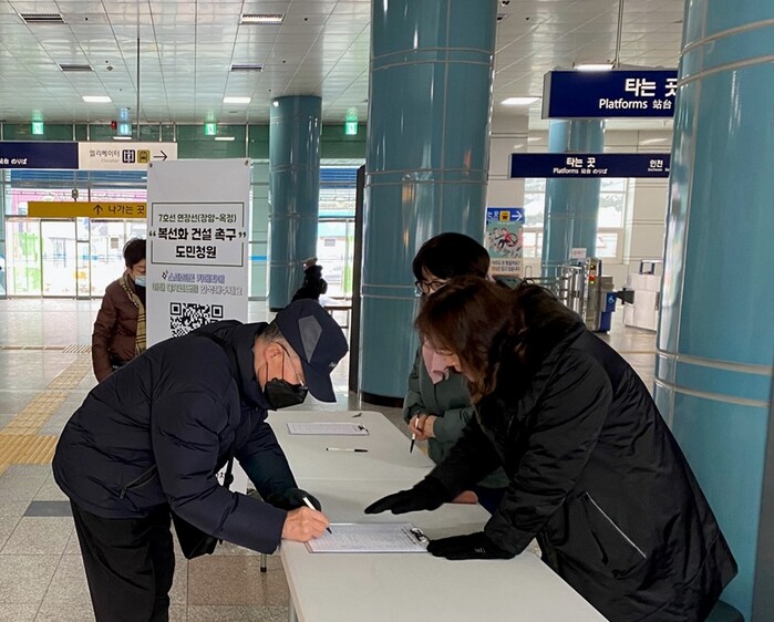 이에 보조를 맞춰 녹양동 주민자치회도 복선화의 필요성을 주민들에게 널리 알리고자 이날 주민자치회 위원 등 9명이 녹양역 대합실에서 오프라인 서명운동을 펼쳤다.