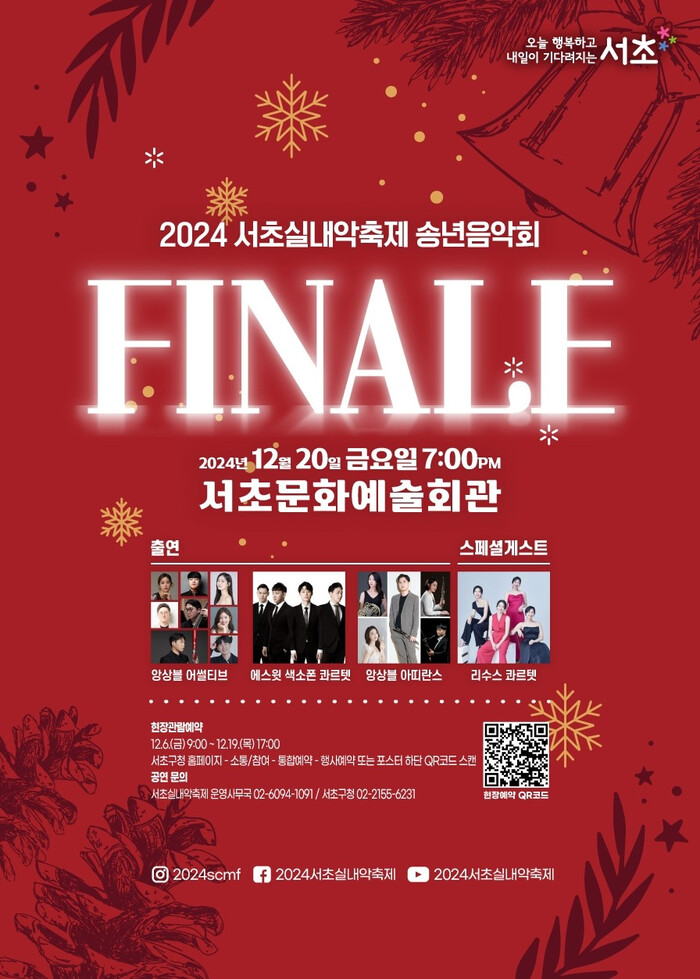 [시민일보 = 이대우 기자] 서초구(구청장 전성수)는 오는 20일 서초문화예술회관 아트홀에서 ‘2024 서초실내악축제 송년음악회 「피날레(FINALE)」’를 개최한다.