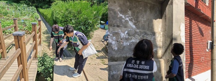 | ▲ 은평구 여성민방위대원들이 장마 취약 노후주택과 건물의 안전 점검을 하고 있다. (사진=은평구청 제공) |