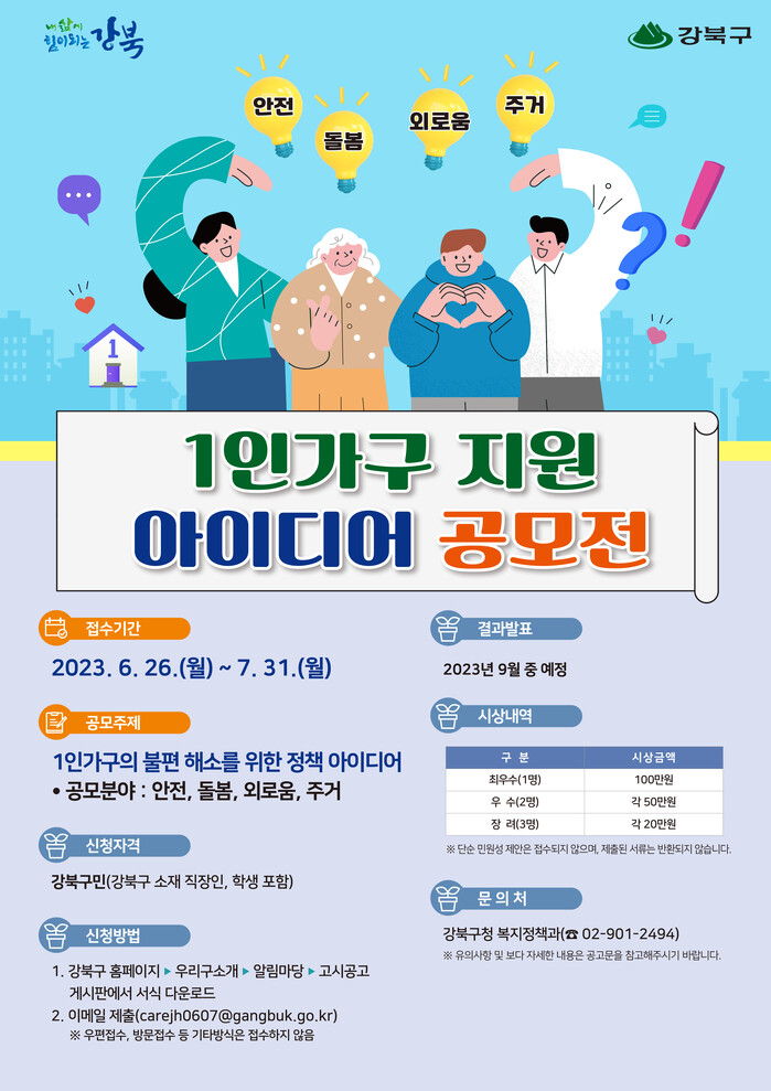 [시민일보 = 홍덕표 기자] 서울 강북구(구청장 이순희)가 오는 26일부터 7월31일까지 '1인가구 지원 정책 아이디어'를 공모한다.