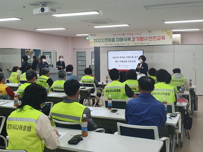 교육 내용은 △치매 극복걷기 행사 총괄 내용 △치매극복 걷기 행사 진행 안전에 관한 사항 △ 차량 이송 안전에 관한 사항 △진행요원 역할 분담 등으로 이루어졌다.