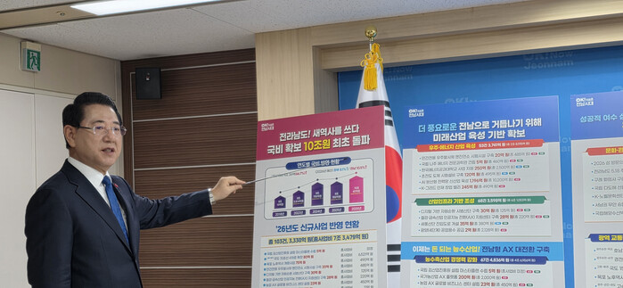 | ▲ 전남도 김영록 도지사가 도청 프리핑 룸에서 26년도 국비 예산 확보를 설명하고 있다(사진=황승순 기자) |