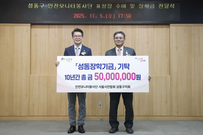 정원오 구청장은 "10년 동안 변함없이 지역 인재 육성을 위해 장학금을 기부해 주신 성동구 안전모니터봉사단에 진심으로 감사드린다"라며 "이러한 꾸준한 나눔이 성동구의 안전문화와 교육문화 모두를 풍요롭게 하고 있다"라고 말했다.
