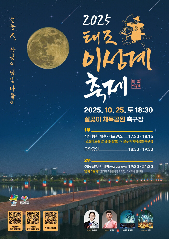 [시민일보 = 박소진 기자] 성동구(구청장 정원오)는 오는 25일 살곶이 체육공원 일대에서 ‘2025년 태조 이성계 축제’를 개최한다고 밝혔다.