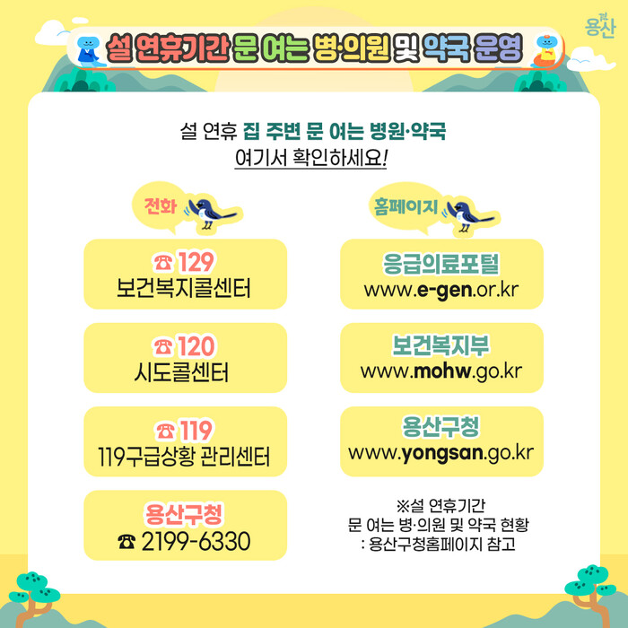 특히 연휴 기간에 운영하는 병의원(34곳)과 약국(109곳) 정보는 구청 홈페이지에 게재하고, 구 SNS, 알림톡 등을 통해 구민에게 적극적으로 홍보할 계획이다.