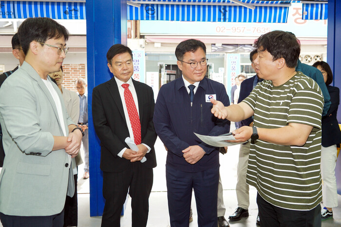 | ▲ 6월 7일 청량리종합시장을 방문하여 ‘우리시장 빠른배송’에 대한 설명을 듣고 있는 이필형 동대문구청장(사진 왼쪽에서 두 번째)과 백원국 국토교통부 제2차관(사진 왼쪽에서 세 번째) (사진=동대문구청 제공) |