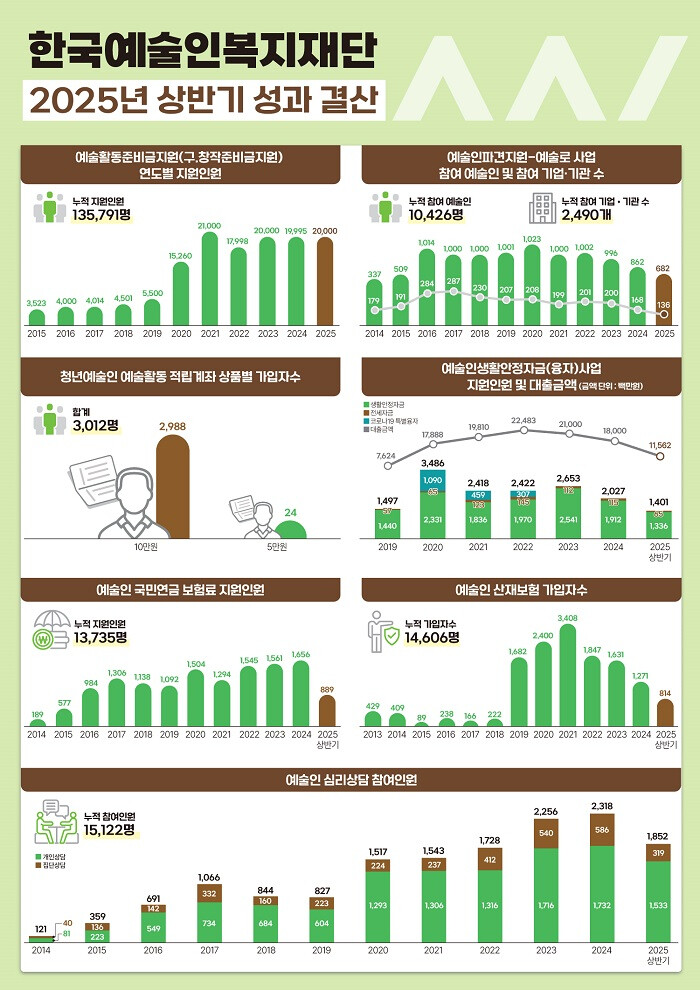 재단의 정용욱 대표는 “예술인이 예술활동에만 전념할 수 있는 환경을 만들고자 2025년 상반기에는 제도의 실효성을 높이기 위한 제도 개선과 신속한 지원에 집중했다”며, “앞으로도 예술인의 삶을 실질적으로 변화시키는 복지, 그리고 안전하고 공정한 예술환경을 위한 기반 마련에 최선을 다하겠다”고 밝혔다.