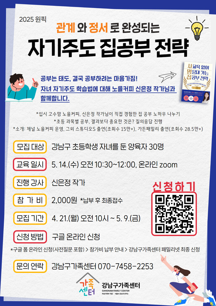 [시민일보 = 이대우 기자] 강남구가족센터(센터장 권요안)는 오는 9일까지 초등학생 자녀를 둔 양육자 30명을 대상으로 ‘자기주도 집공부 전략’ 교육 참여자를 모집한다.