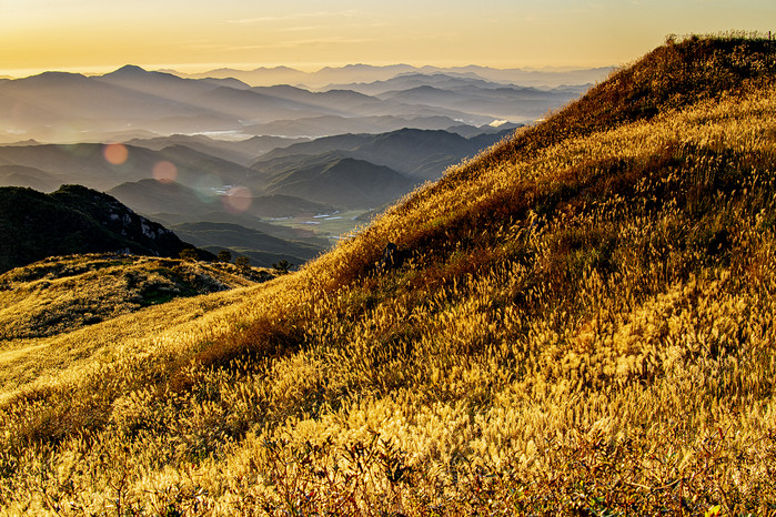 해발 1,000m 황매평원의 억새는 축구장 60개 크기 규모로 정상주차장에서 도보로 10분만 걸으면 만날 수 있으며 이곳에서 태양에 비춰지는 억새잎은 은빛 바다에 와있는 착각을 불러온다.