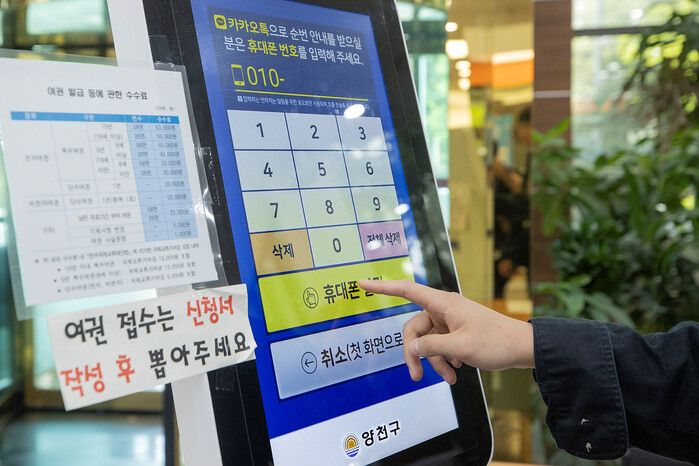| ▲ 키오스크에서 알림톡 서비스를 위해 휴대폰 번호를 입력하고 있는 모습 (사진=양천구청 제공) |