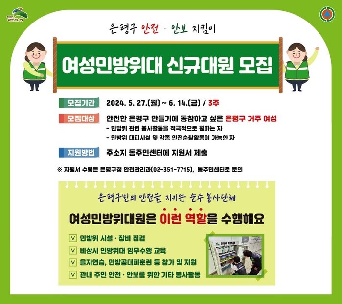 [시민일보 = 이대우 기자] 은평구(구청장 김미경)가 안전한 우리동네 은평 만들기를 위해 오는 14일까지 순수봉사단체 여성민방위대 신규 대원을 모집한다.