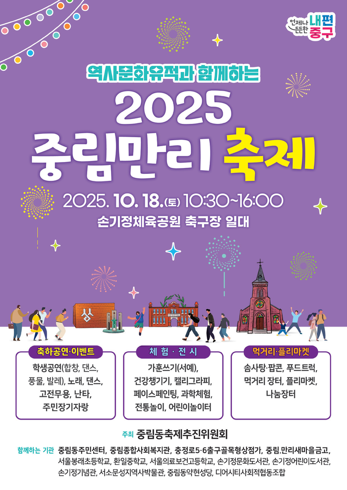 [시민일보 = 여영준 기자] 서울 중구는 중림동 손기정체육공원 축구장 일대에서 오는 18일 오전 10시~오후 6시 ‘2025 중림만리 축제’가 열린다고 밝혔다.